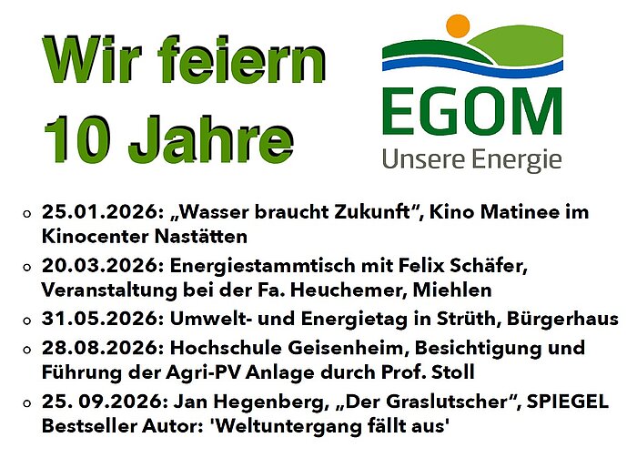 Am 13. Februar 2016 wurde die Energiegenossenschaft Oberes Mühlbachtal eG kurz „EGOM“ von zehn motivierten Gründungsmitgliedern im Bürgerhaus in Strüth gegründet. Den Startimpuls dazu gab der Ausschuss für Energie und Umwelt der Gemeinde Strüth zusammen mit dem Sachausschuss EineWeltFairWandeln.