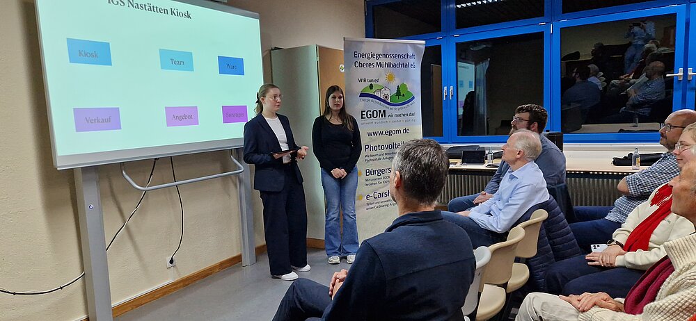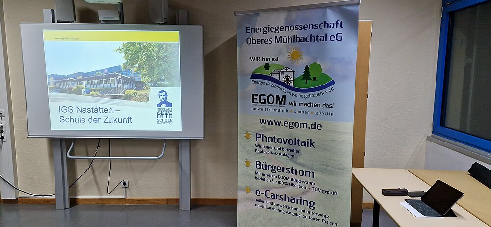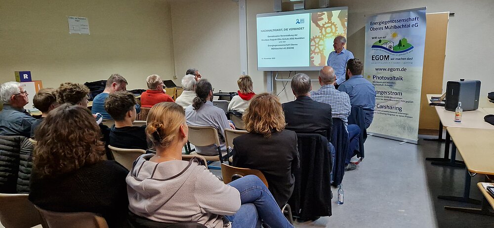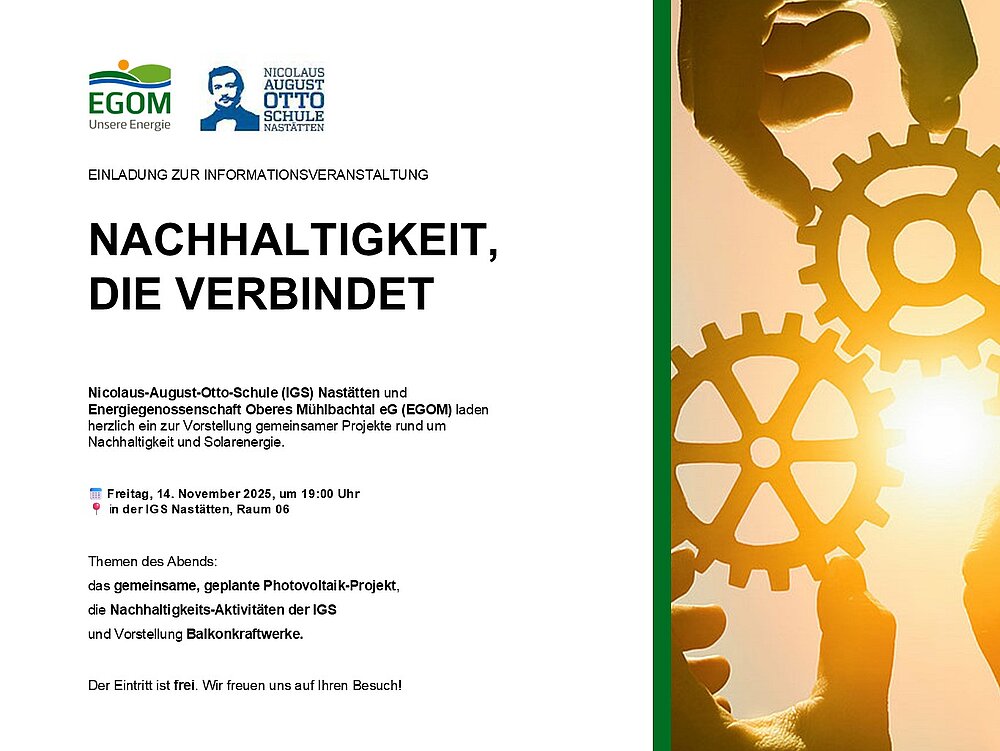 Nachhaltigkeit, die verbindet! Unter diesem schönen Motto fand am Freitag, den 14.11. in der Nicolaus-August-Otto-Schule ein Informationsabend für Interessierte, Eltern, Schüler und Lehrer statt. Veranstaltet wurde der Abend von der EGOM (Energie Genossenschaft Oberes Mühlbachtal) und der IGS Nastätten. In vielen sehr interessanten Vorträgen wurden nachhaltige Projekte vorgestellt. Herr Schwab und Herr Adler von der EGOM stellten sehr fundiert und mitreißend die Aktivitäten der EGOM vor, die sich hauptsächlich in den Bereichen der nachhaltigen Energiegewinnung durch Solarstrom engagiert. Die Vorstellung der unkompliziert anzubringenden Balkonkraftwerke fand dabei an dem Abend besondere Beachtung. Gerade der Genossenschaftsgedanke macht die Arbeit der Genossinnen und Genossen attraktiv.